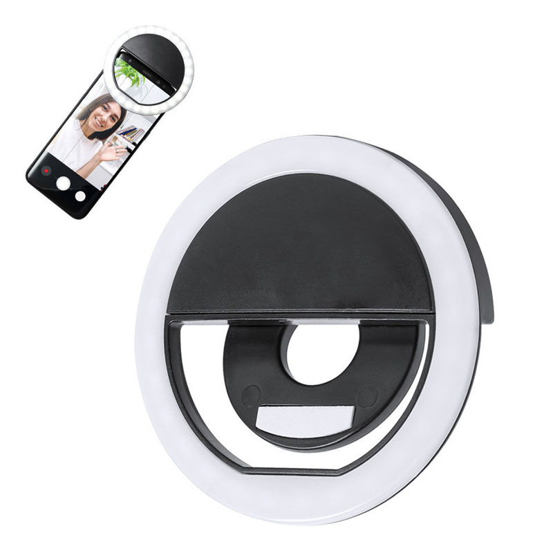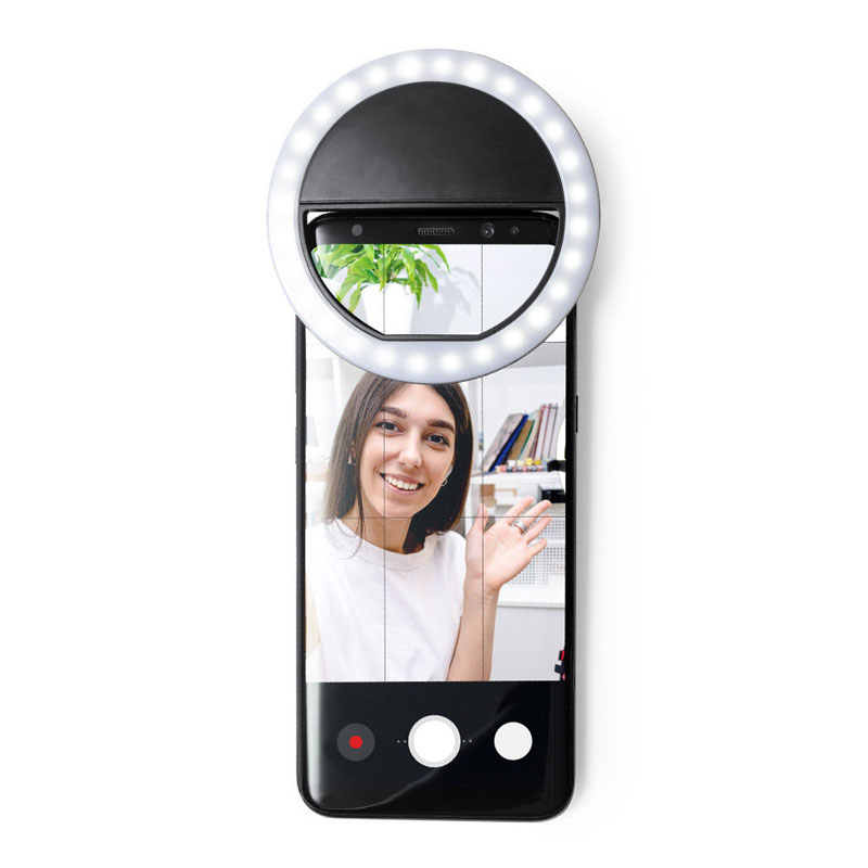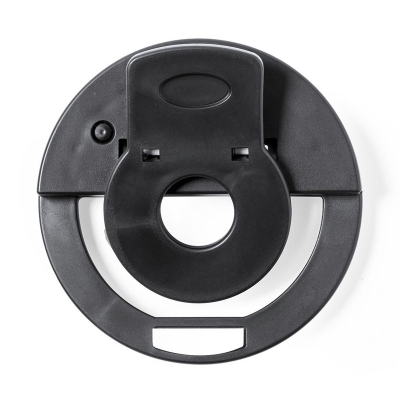 Luce ad anello a LED con supporto per smartphone, realizzato in ABS resistente. 28 LED, con 3 livelli di intensità e ricaricabile via USB (cavo Micro USB incluso).
