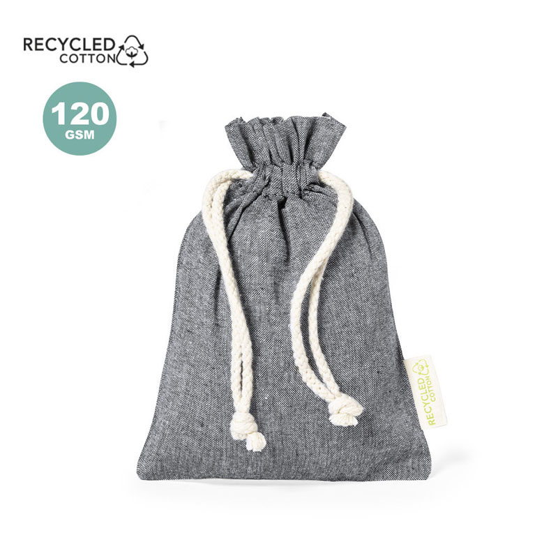 Chiusura con coulisse in cotone e finiture cucite, compresa etichetta esterna con il logo del cotone riciclato.