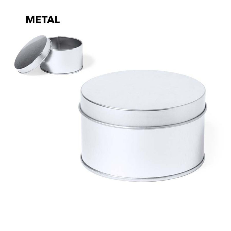 Scatola di presentazione rotonda, in robusto metallo argentato, con coperchio coordinato.