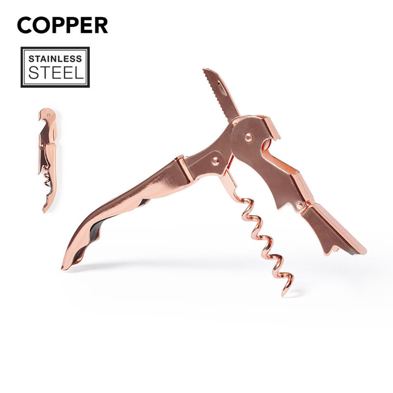 Apribottiglia e Cavatappi a 2 tempi in acciaio inox con rivestimento in rame galvanizzato.
