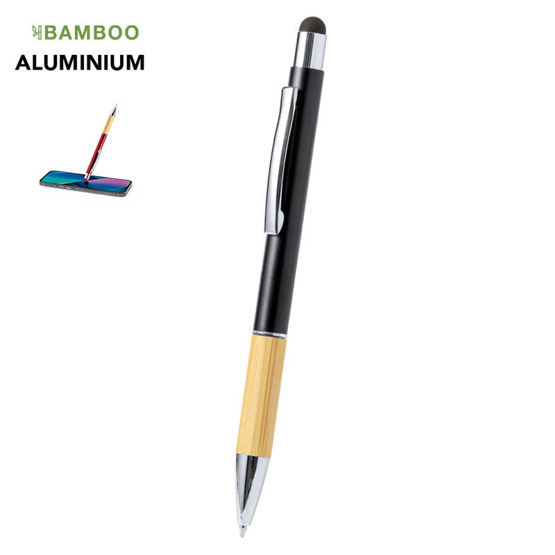Elegante penna touch in bambù e alluminio con meccanismo a rotazione.