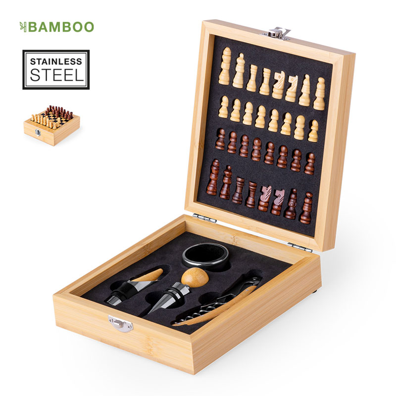 Originale set da vino con scacchi -pezzi inclusi- rifiniti in bambù naturale.