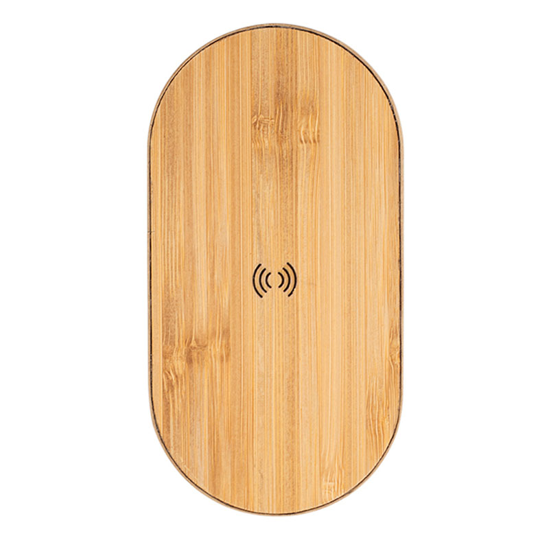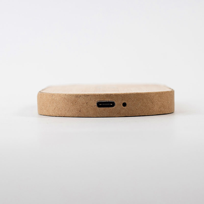 Base di ricarica wireless realizzata in bamboo e cartone FSC.