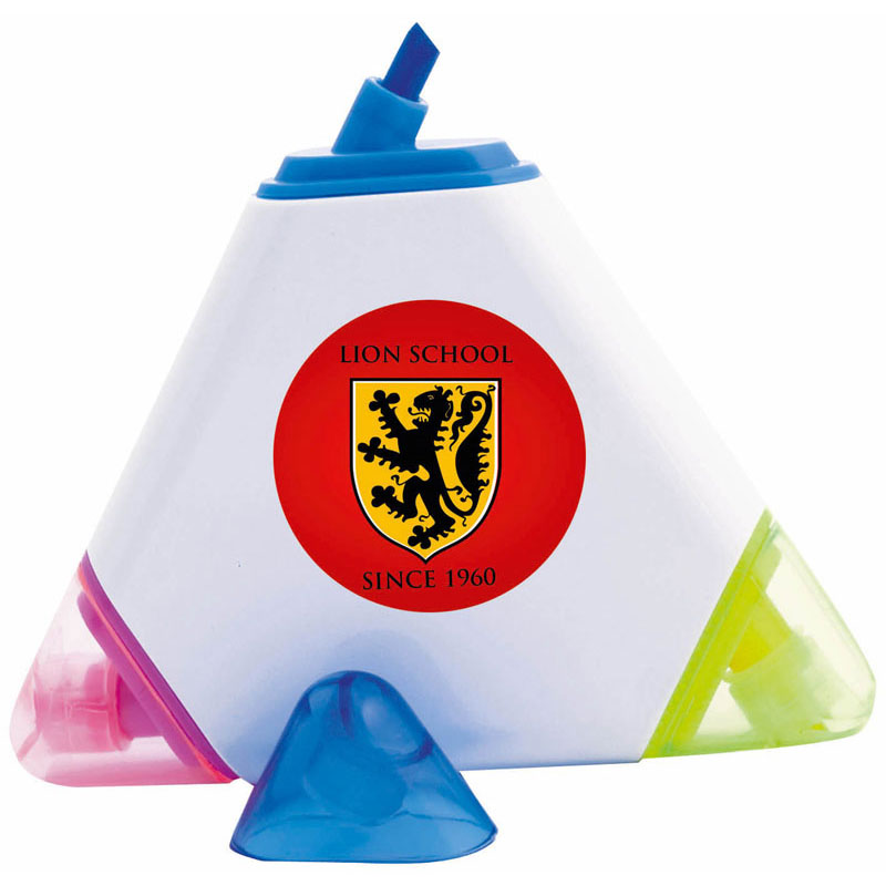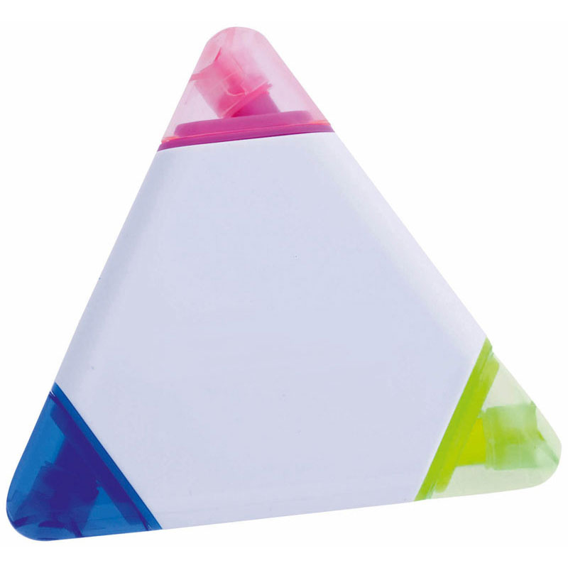 Evidenziatore a tre colori, con corpo triangolare dalla finitura bianca lucida, progettato appositamente per la stampa digitale a colori.