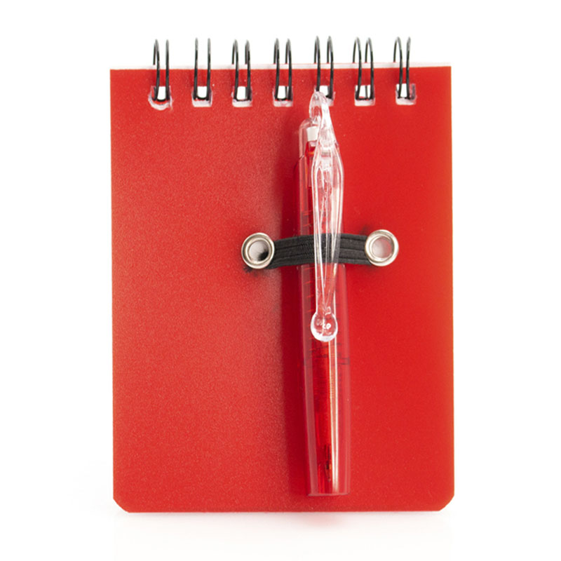 Mini notebook ad anello in colori divertenti, con 60 fogli con layout a strisce, mini penna a sfera sulla cover con porta penna elastico.