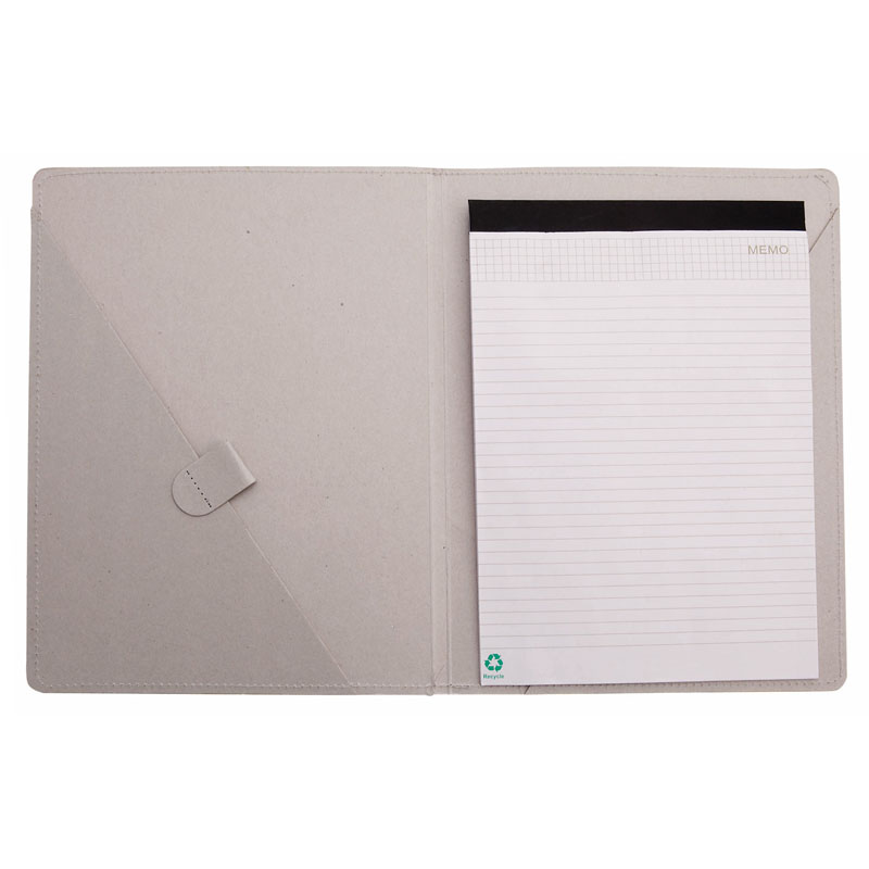 Cartella in cartone riciclato, con cuciture di rinforzo e chiusura a fascia elastica originale.