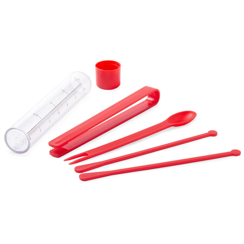 Set per cocktail con 5 accessori: contenitore di misurazione con capacità di 60 ml, cucchiaio per intaglio, pinze e due agitatori.