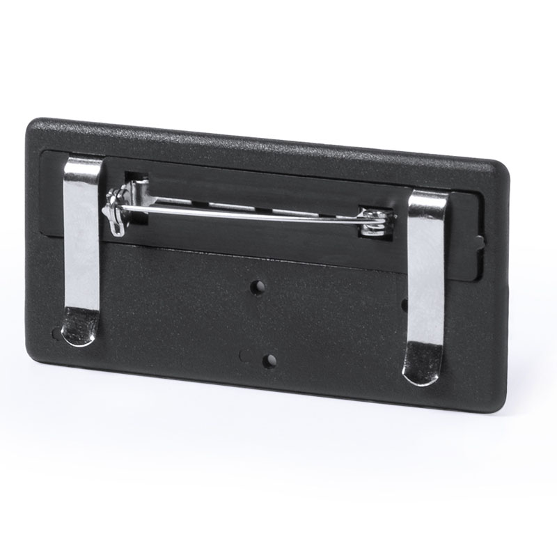 Lato posteriore dotato di clip di aggancio e spilla di sicurezza per un fissaggio certo.