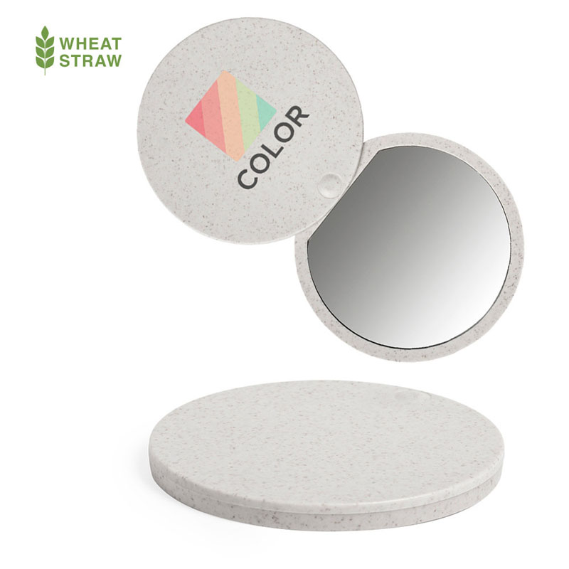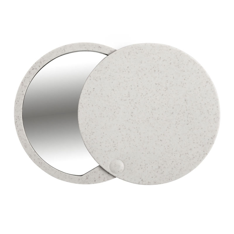 Specchietto da borsetta della linea Nature realizzato in fibra di grano e ABS per promuovere l'uso di materie prime naturali e ridurre le emissioni inquinanti.