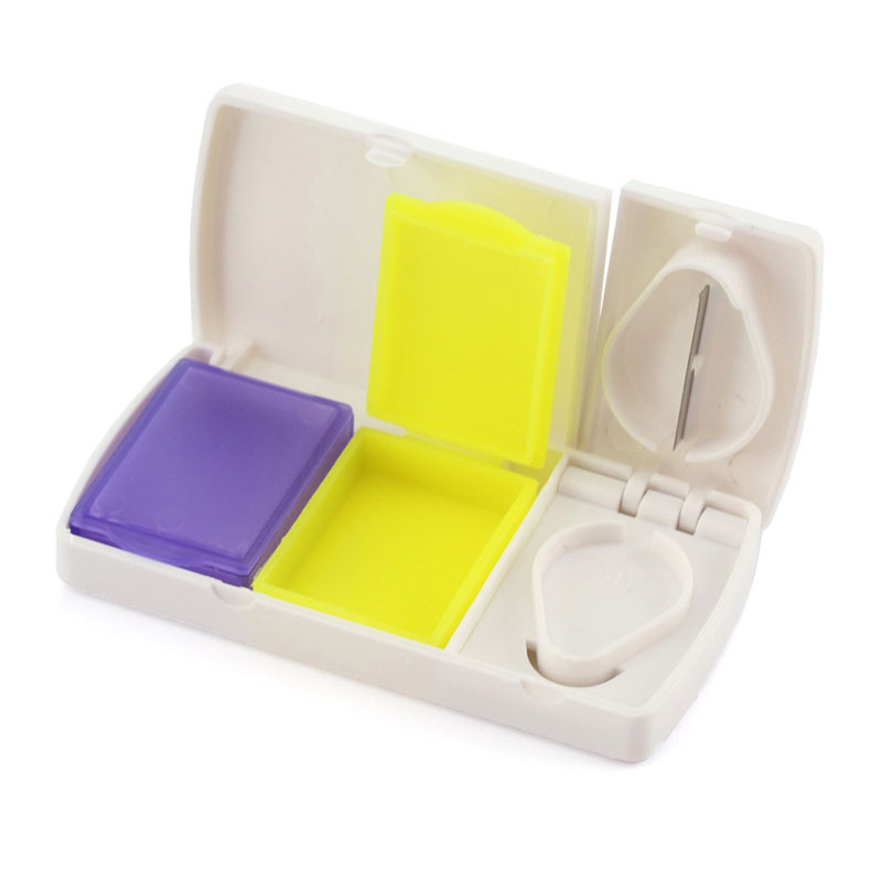 Portapillole con 2 scatole interne, chiusura di sicurezza e lama per dividere le pillole.