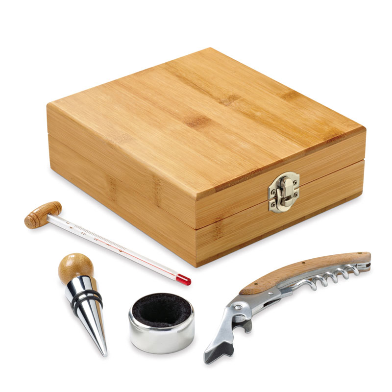 Set vino 4 accessori in elegante scatola regalo in legno.