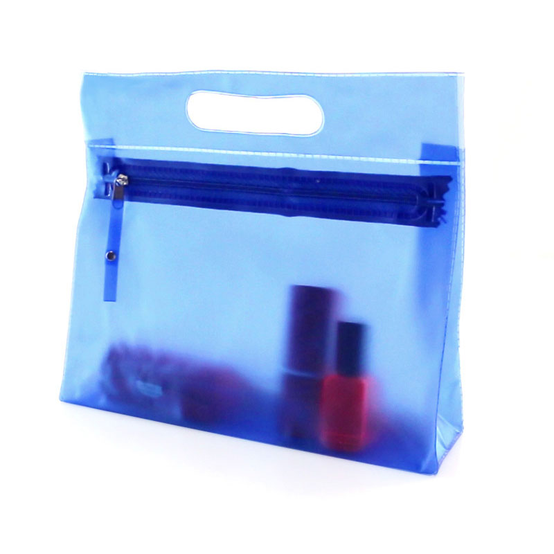 Beauty multiuso in PVC smitrasparente con manico fustellato resistente e chiusura con cerniera.