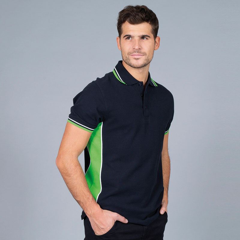 • Doppio piping bicolore su colletto e fondo manica in rib