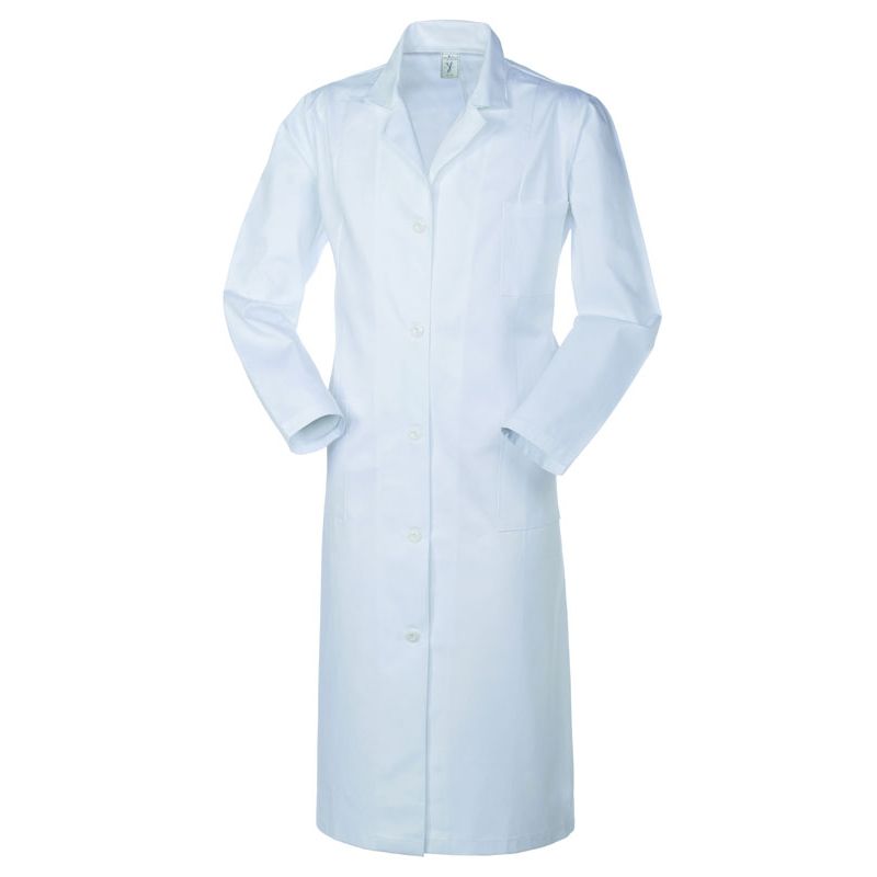 Vestaglia lavoro da donna con un taschino applicato al petto sinistro, chiusura centrale con bottoni scoperti, due tasche inferiori applicate, schiena con cucitura centrale, martingala posteriore libera in due pezzi con due bottoni centrali, spacco posteriore.
