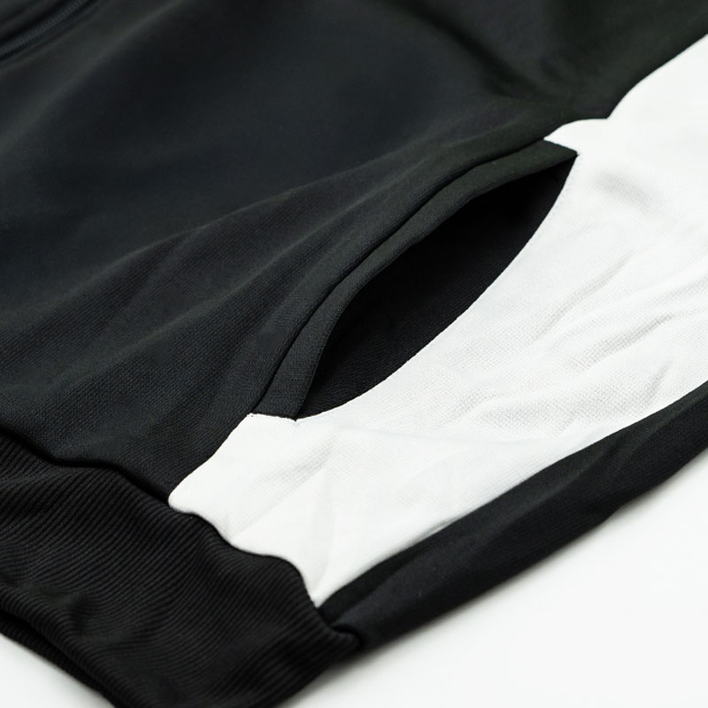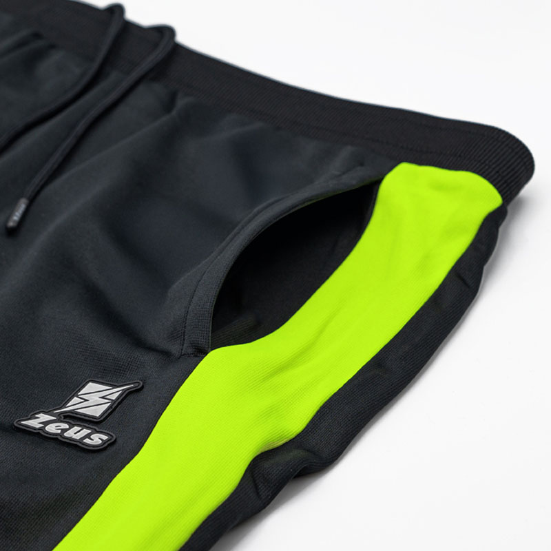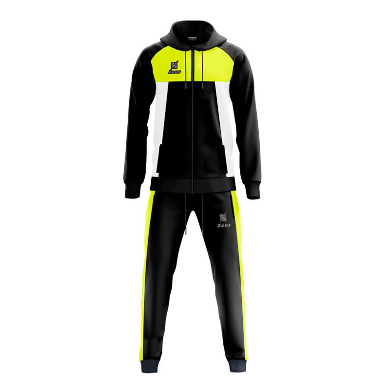 La giacca è dotata di tasche laterali e il pantalone include inserti laterali e lacci, il tutto realizzato in 100% poliestere.