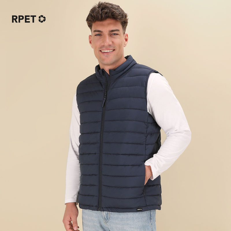 Gilet unisex in morbido e caldo poliestere 100% RPET, realizzato in plastica riciclata per favorire il riutilizzo dei rifiuti plastici e contribuire alla sostenibilità del pianeta. Materiale leggerissimo effetto piuma, impermeabile e antivento, con imbottitura interna.