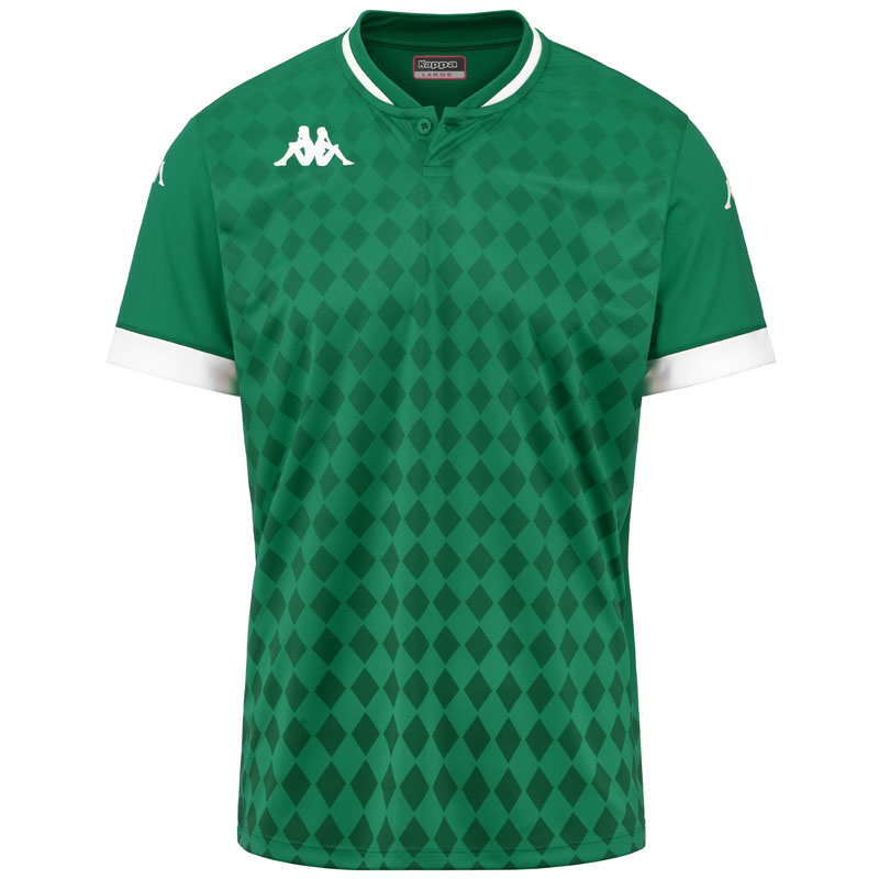 Manica corta, girocollo con chiusura a bottone, inserto sul fondo manica e grafica stampata in sublimazione sul pannello frontale.