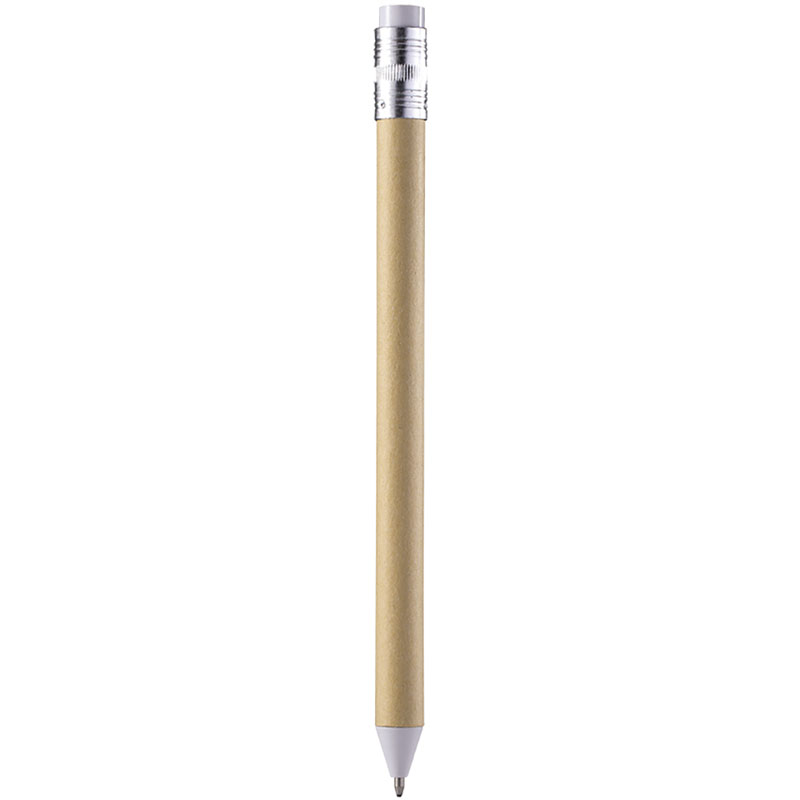 Penna a sfera in cartone riciclato, a forma di matita, chiusura a scatto.