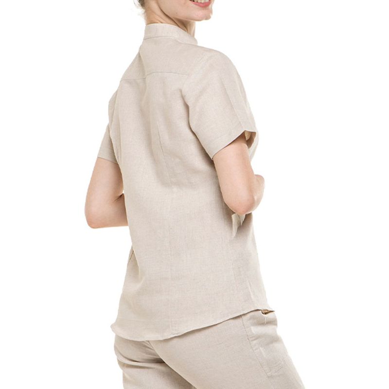 Camicia in lino con collo coreano da donna. Realizzata per garantire uno stile e comfort unici durante il lavoro.