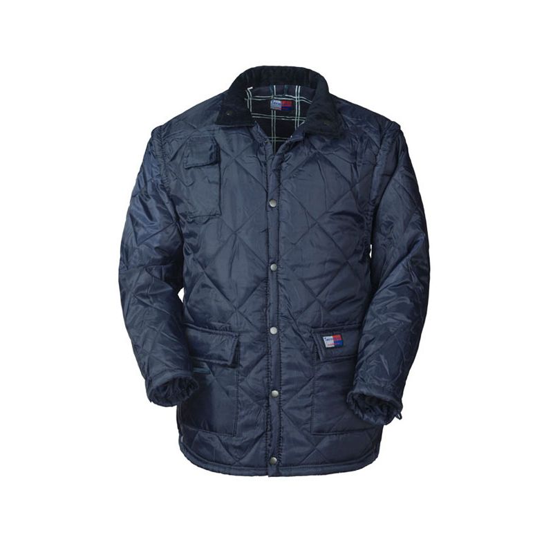 GIUBBOTTO INTERNO: chiusura con bottoni automatici, trapuntato e imbottito con fodera interna in flanella di colore blu a quadretti bianchi, maniche staccabili, colletto in velluto, polsi in maglina elastica, due tasche applicate chiuse con aletta e velcro e taschino a soffietto al petto destro chiuso con velcro, spacchetti al fondo con bottoni automatici.