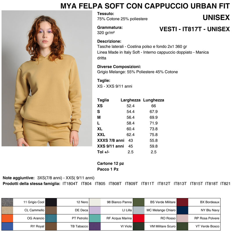 IT817T | Felpa soft mya con cappuccio urban fit unisex