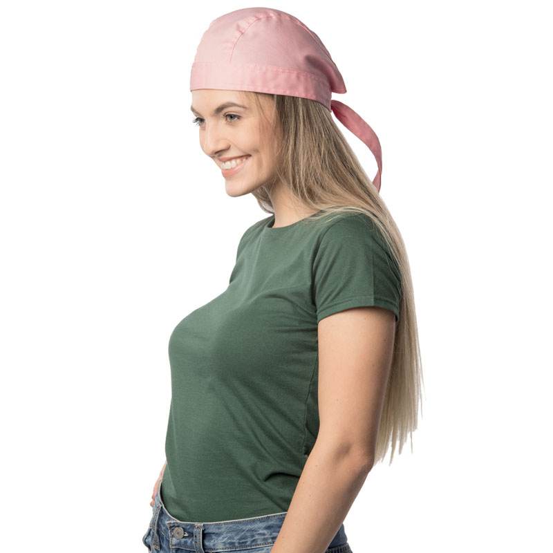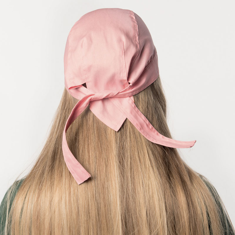 Cappello a bandana in tinta unita e chiusura con nodo sulla nuca.