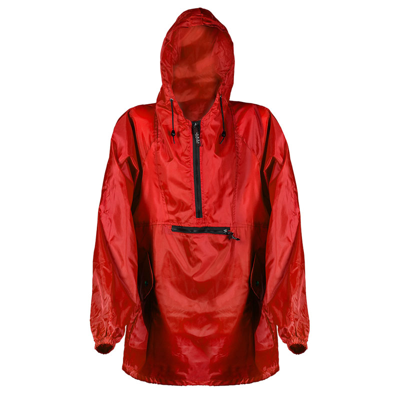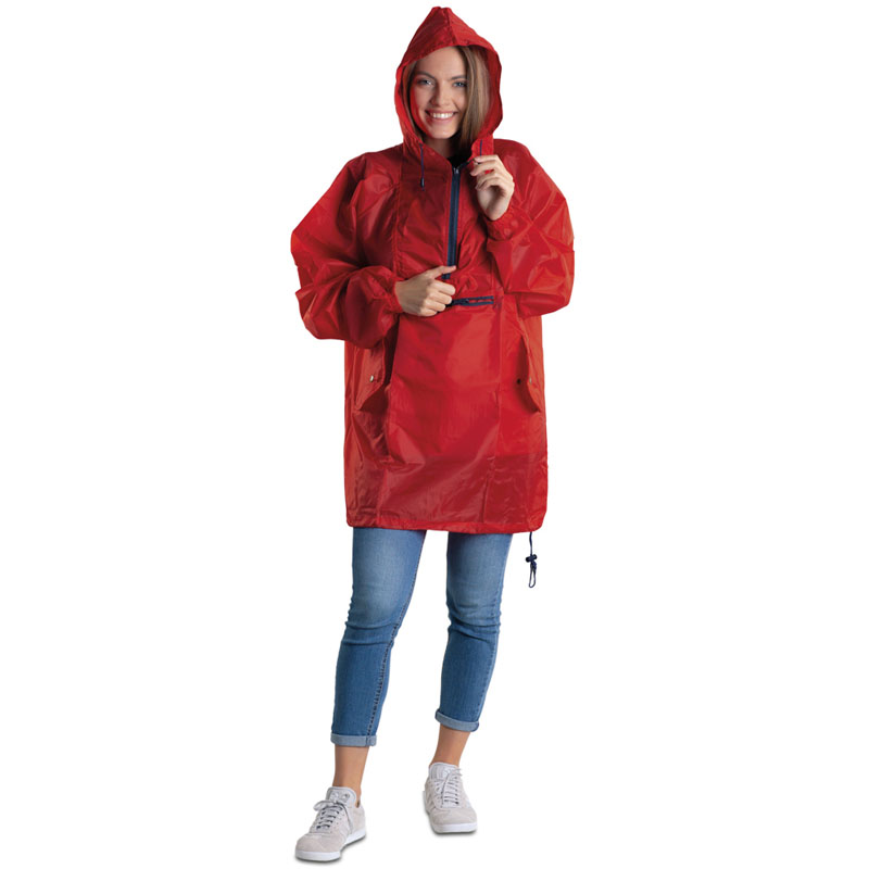 Giacca antipioggia con sacchetto, tasche laterali oblique e tascone centrale con zip, polsini con elastici.