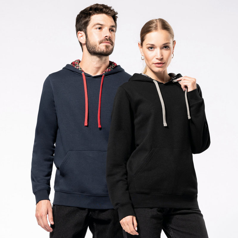 • Cappuccio foderato con tessuto a tema in cotone jersey stampato e coulisse a contrasto
