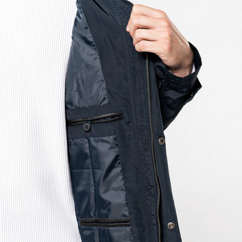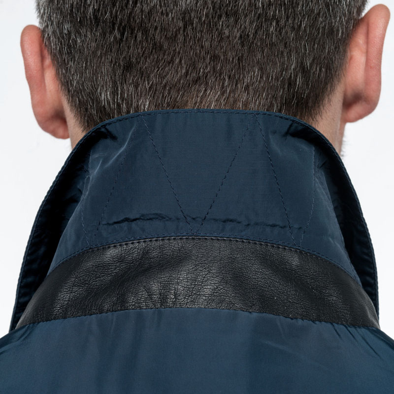 - Listino collo esterno e tasche interne in tessuto fantasia spalmato