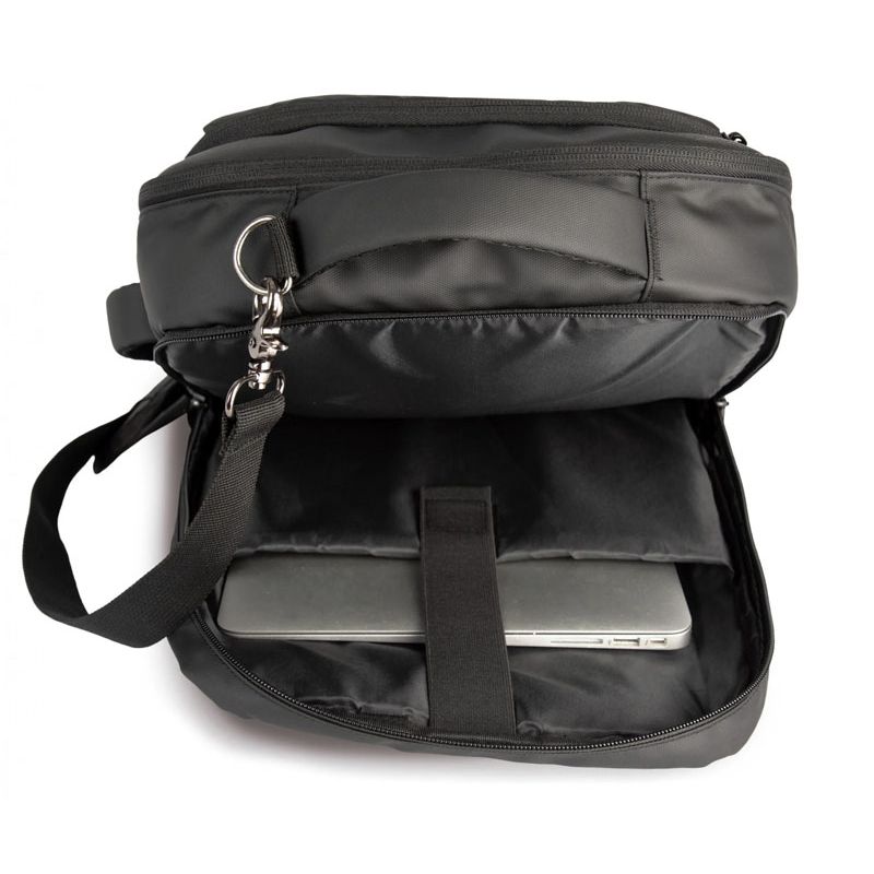 - Grazie agli spallacci amovibili imbottiti a scomparsa nello schienale, lo zaino si trasforma in borsa da lavoro orizzontale con maniglia laterale.