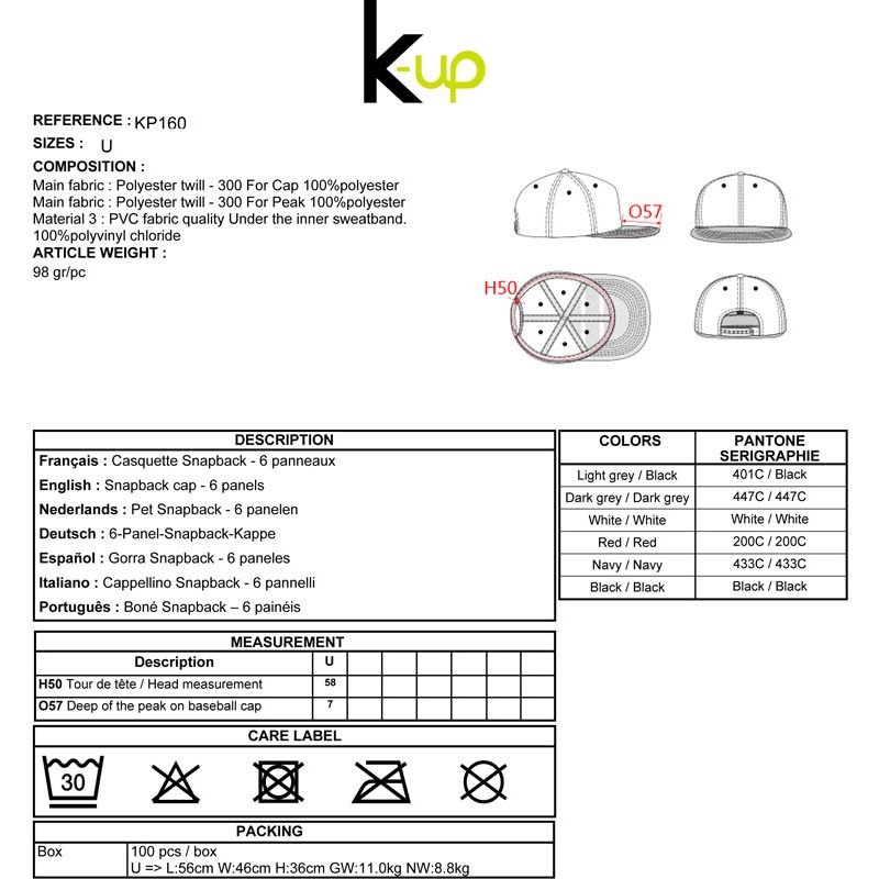 KP160 | Cappellino snapback 6 pannelli visiera piatta