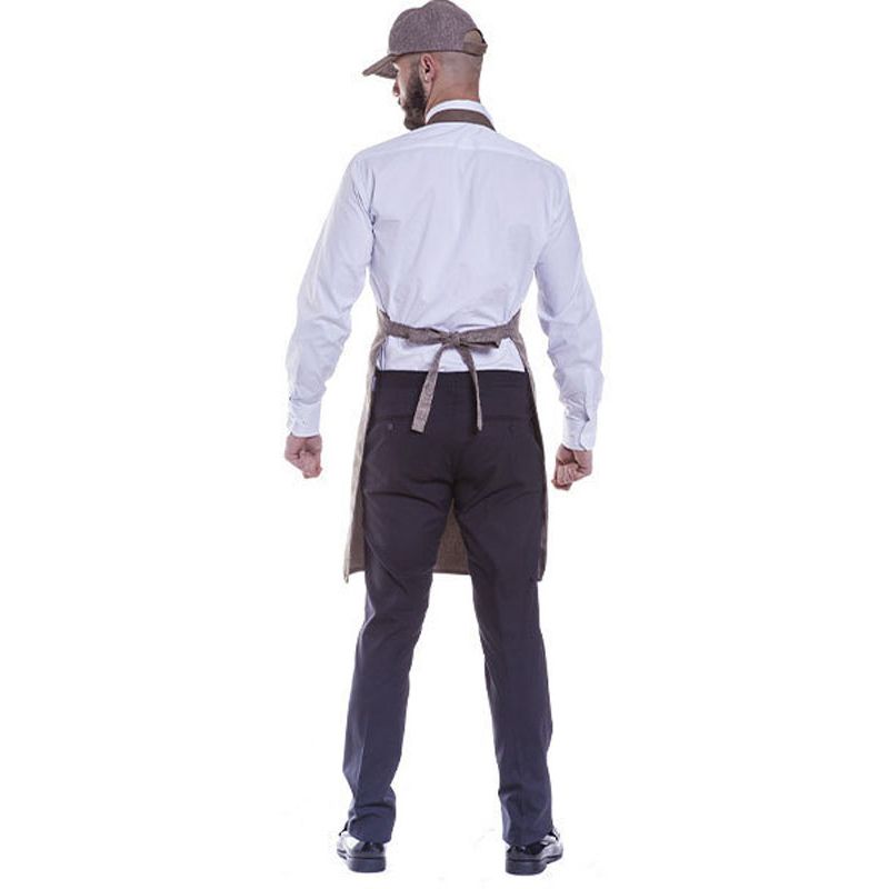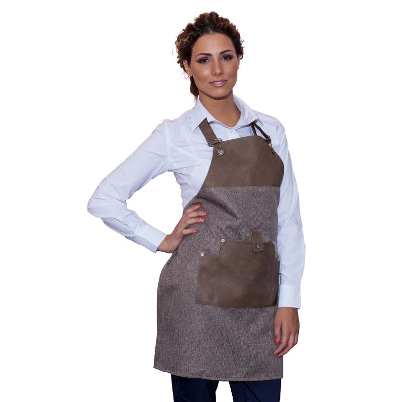 Grembiule con Pettorina realizzato in tessuto canapa antimacchia con dettagli in ecopelle e metallo, decorato con un effetto visivo piacevole.