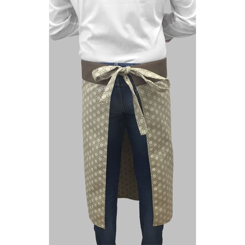 Grembiule lungo realizzato in tessuto antimacchia con dettagli in ecopelle e metallo, decorato con un effetto visivo piacevole.