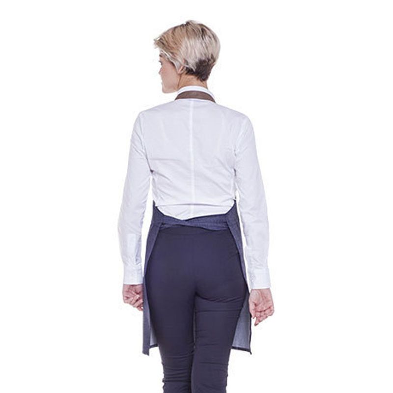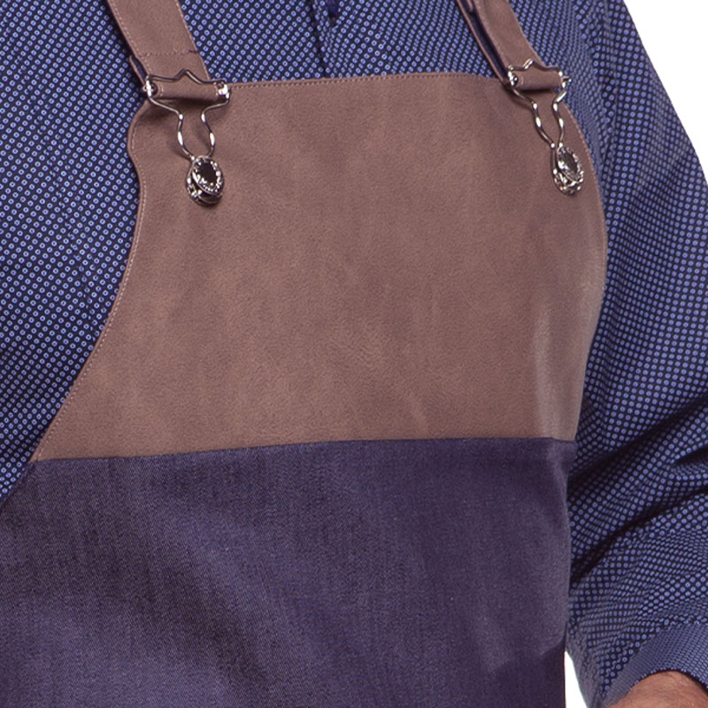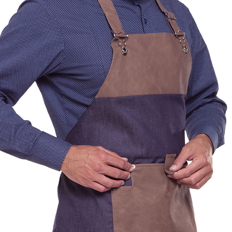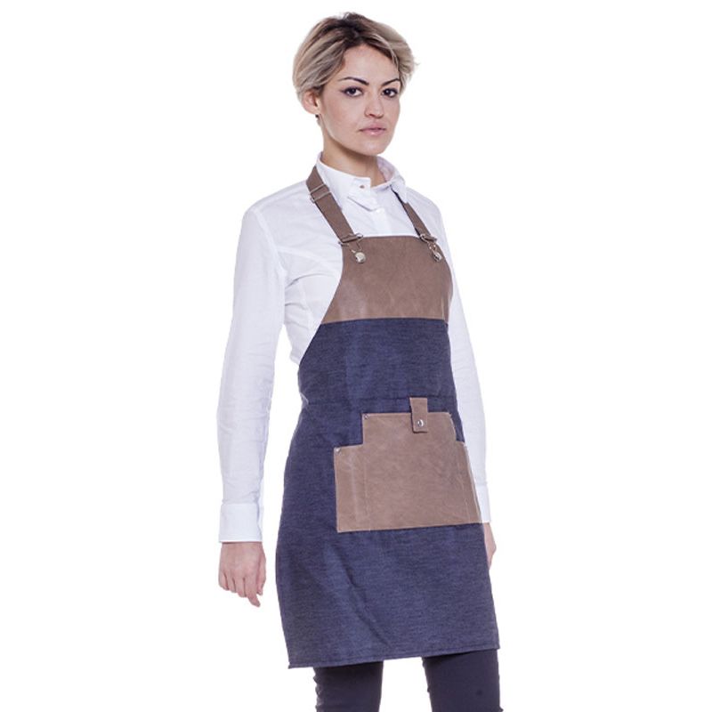 Grembiule realizzato in tessuto Jeans con dettagli in ecopelle e metallo, decorato con un effetto visivo piacevole.