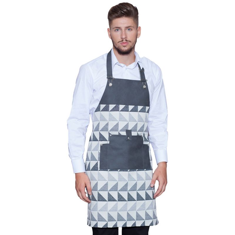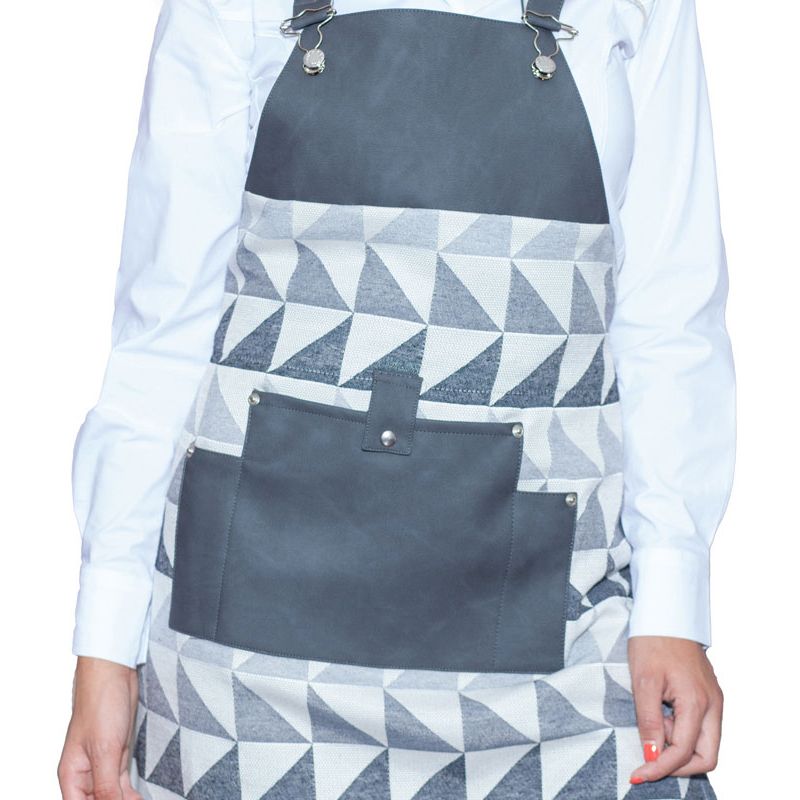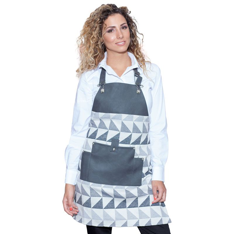 Grembiule con Pettorina realizzato in tessuto antimacchia con dettagli in ecopelle e metallo, decorato con un effetto visivo piacevole.