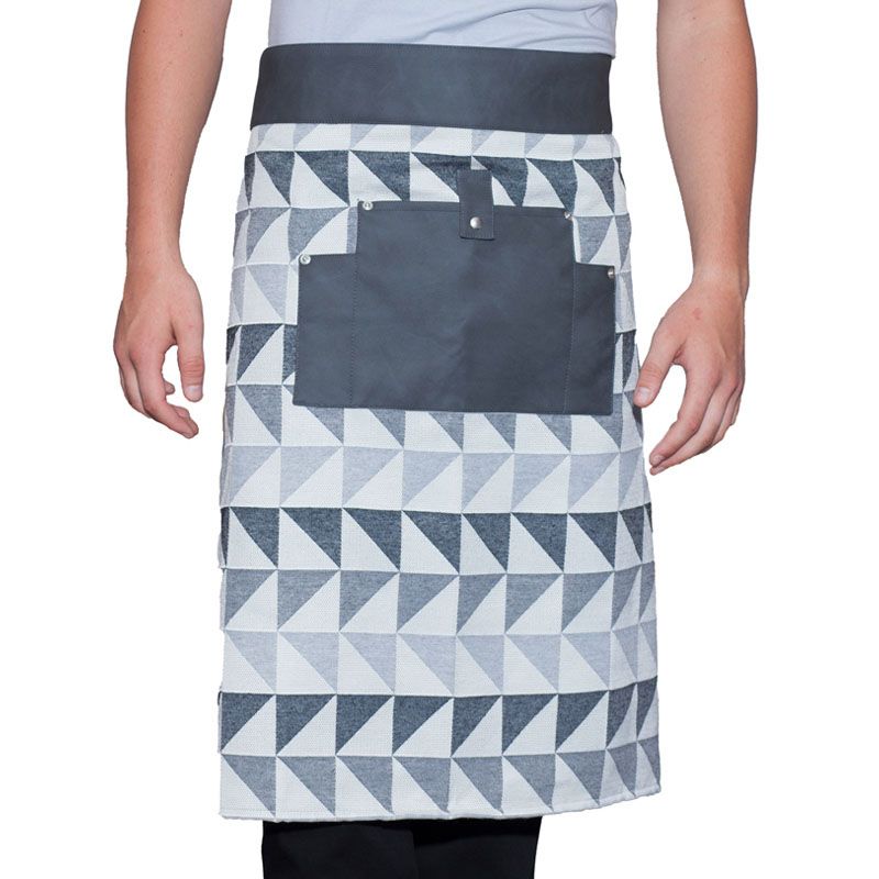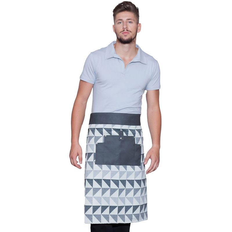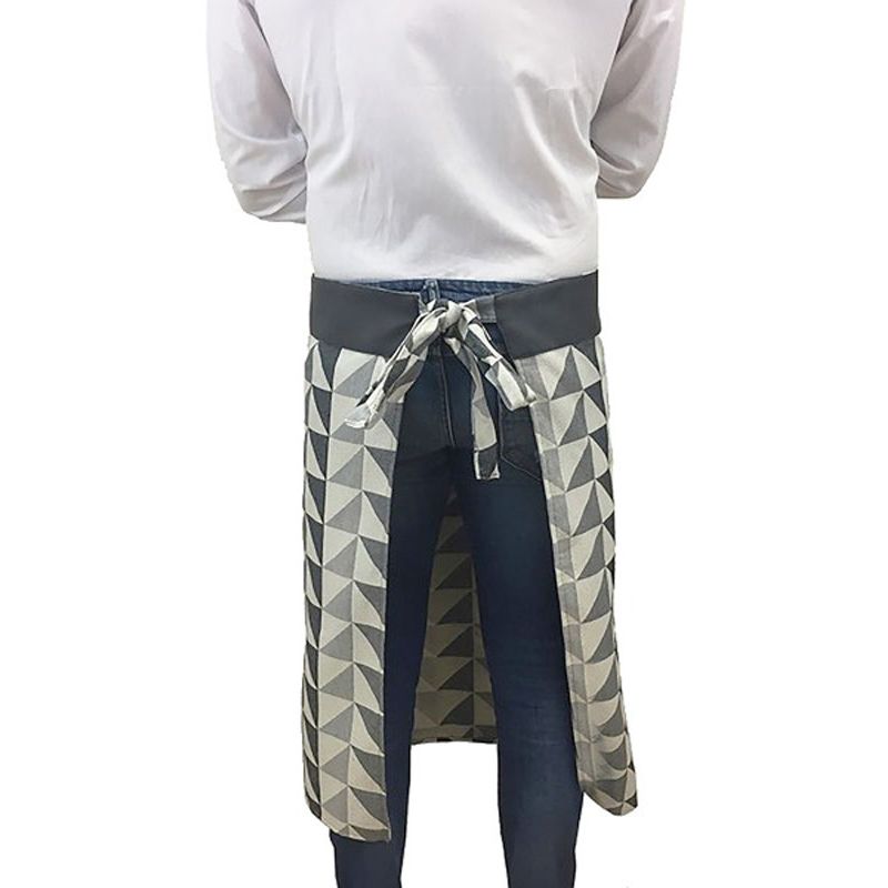 Grembiule lungo realizzato in tessuto antimacchia con dettagli in ecopelle e metallo, decorato con un effetto visivo piacevole.