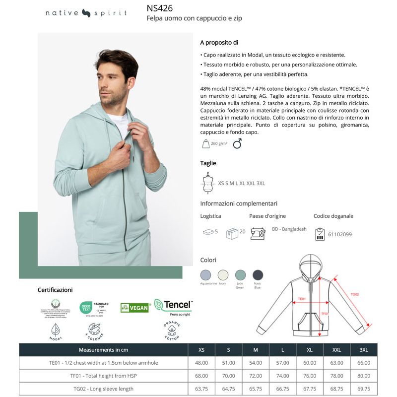 NS426 | Giacca uomo cappuccio zip Ecosostenibile