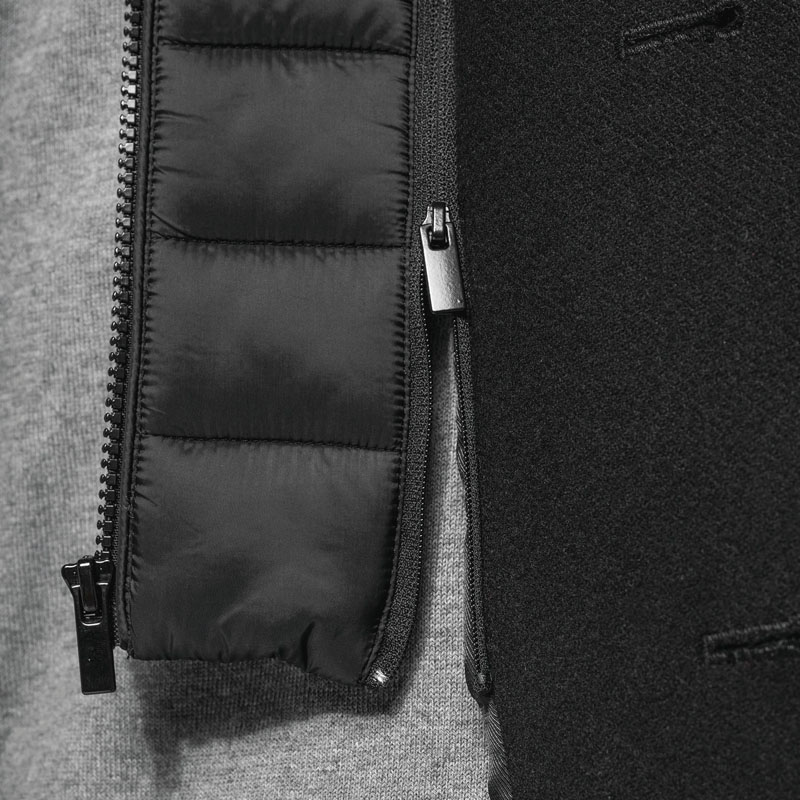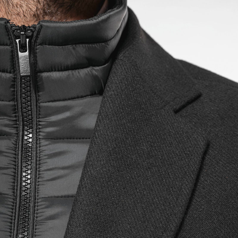 - Capospalla con parte amovibile in poliammide imbottita e impunturata: collo e pettorina anteriore removibile mediante chiusura interna, invisibile.