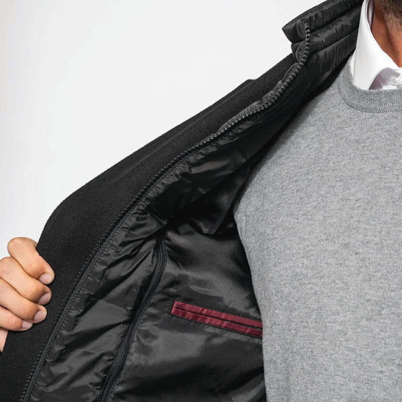 - Tasca interna a filetto a contrasto, due tasche sul petto, di cui una con zip, e una tasca per il telefonino.