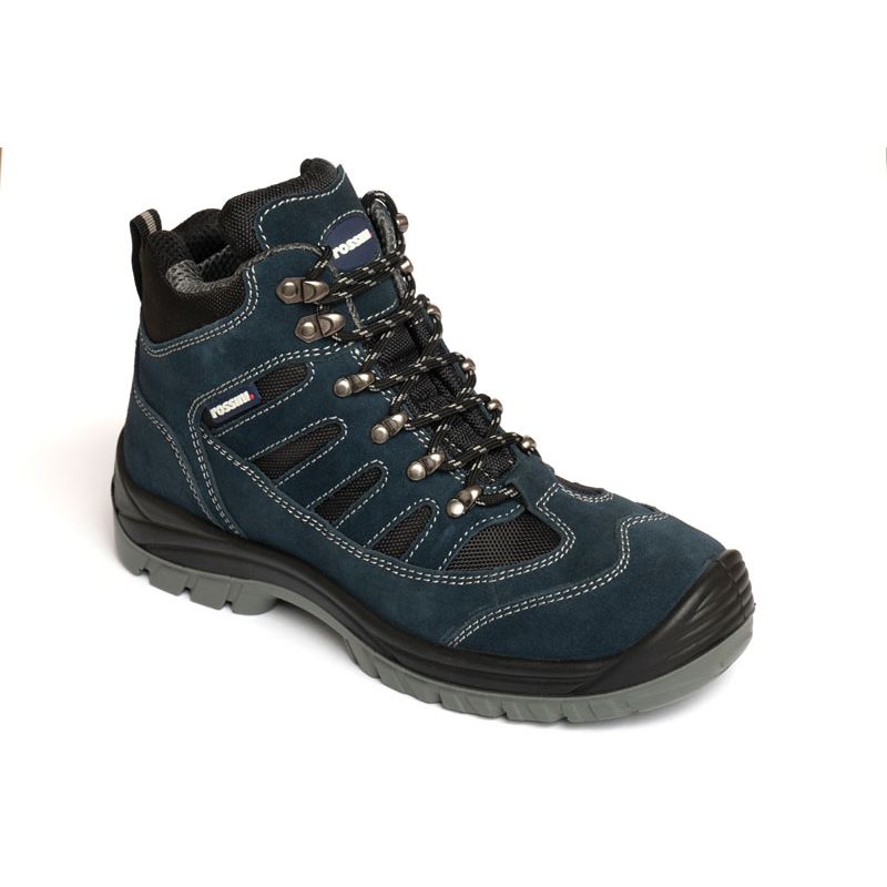 - Calzatura alta in pelle scamosciata colore blu con inserti in nylon e cuciture di colore a contrasto
