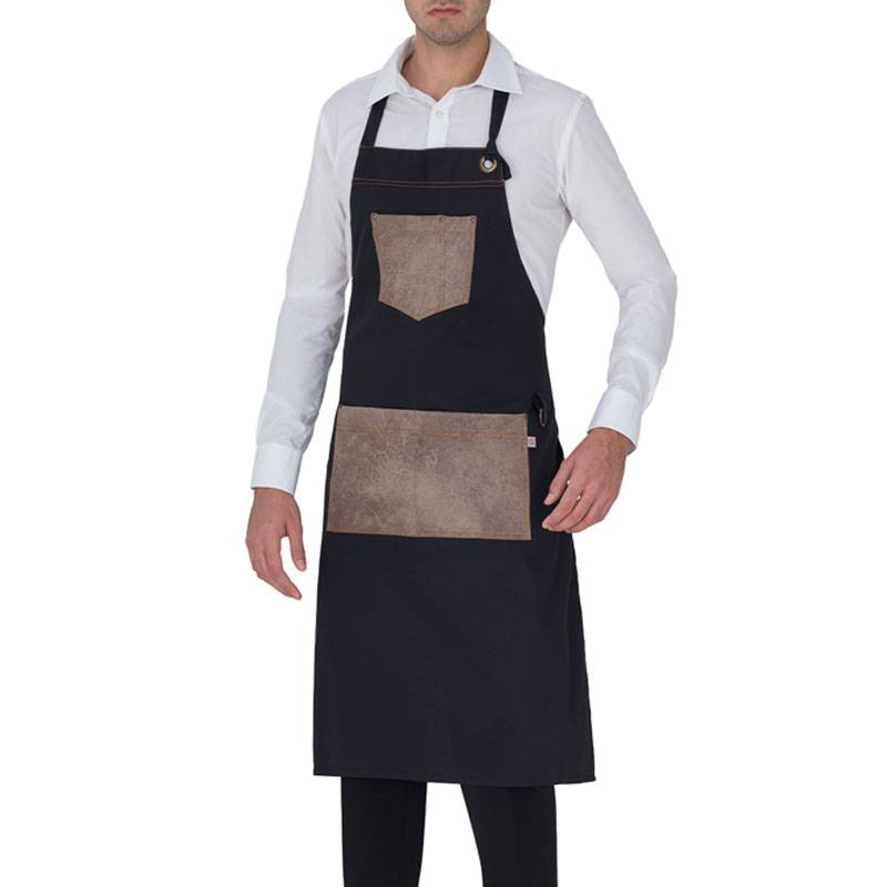 Moderno e di sicuro impatto, questo grembiule con pettorina è realizzato in due diversi tessuti: un raffinato color tortora, realizzato in poliestere cotone in abbinamento alla pelle marrone, e un denim blu 100% cotone, accoppiato all’alcantara.