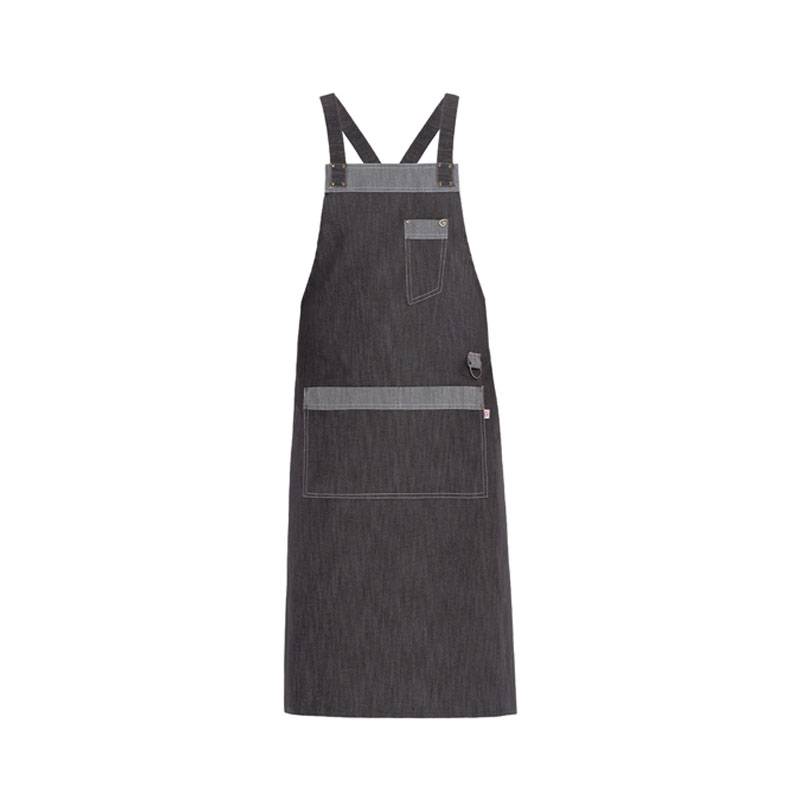 Grembiule pettorina unisex realizzato in pregiato cotone resistente alle alte temperature tinto indantrene, disponibile in due raffinate varianti colore, grigio e marrone.
