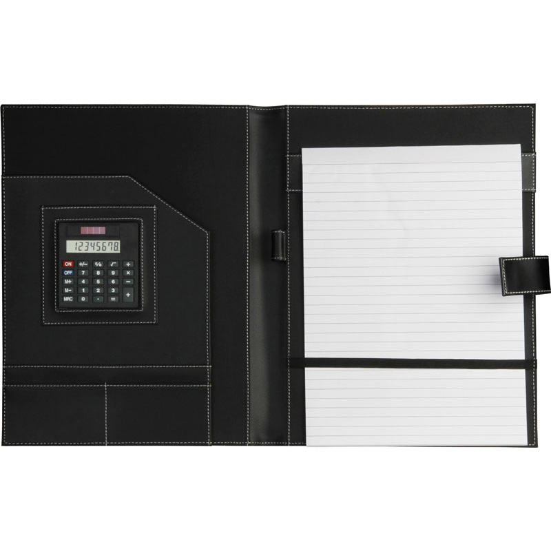 Cartella portablocco in formato A4, con blocco appunti, calcolatrice a 8 cifre dual power, tasche interne portabiglietti, tasca interna portadocumenti, chiusura magnetica.