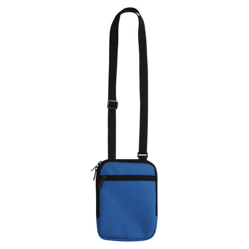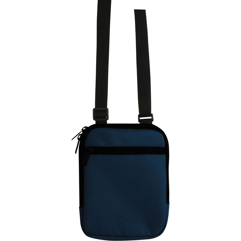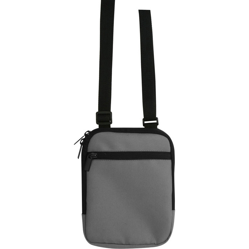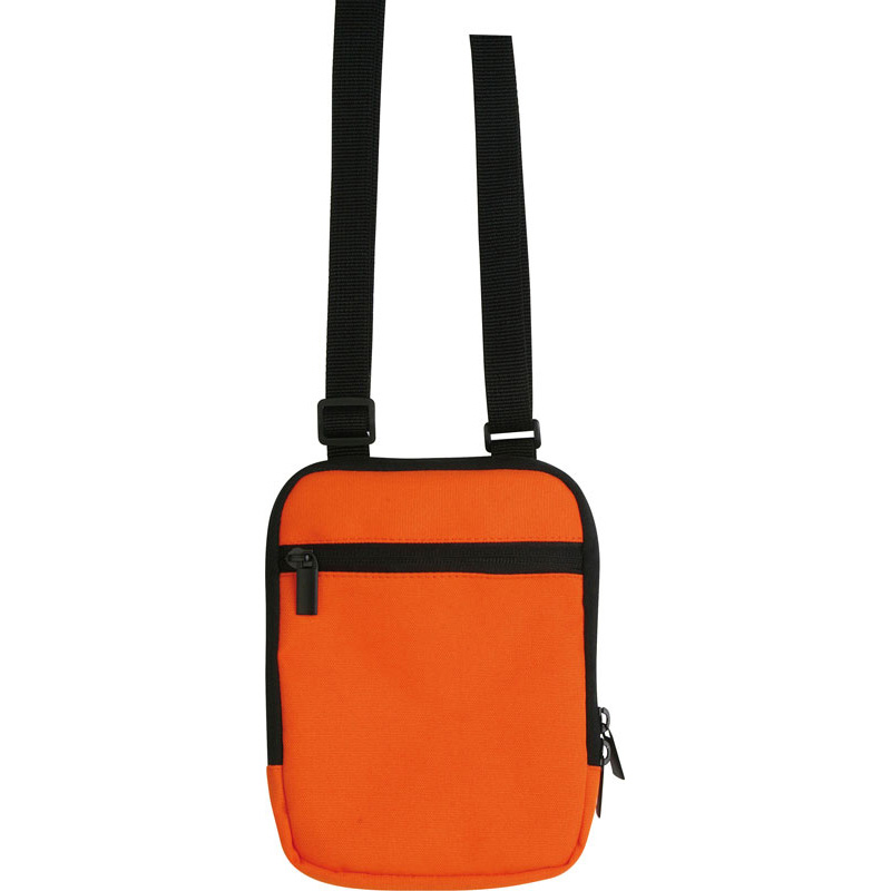 Borsello da spalla con tasca frontale con chiusura a zip, tasca interna con chiusura in velcro, foro per auricolari, tracolla regolabile.