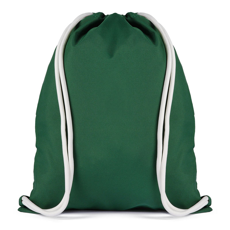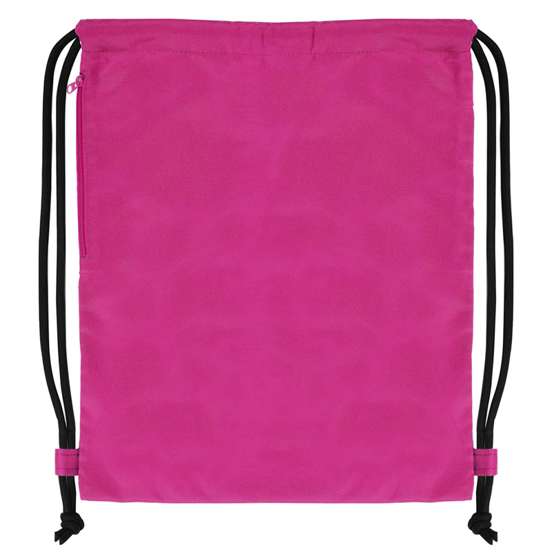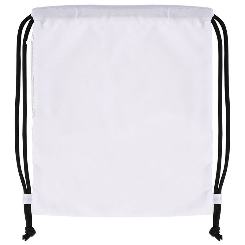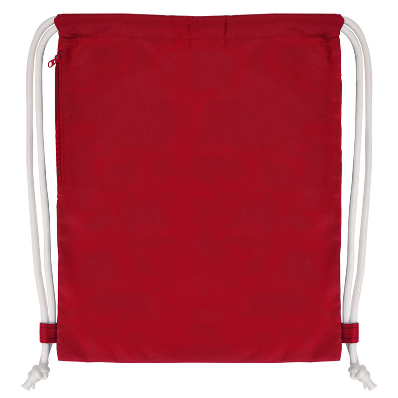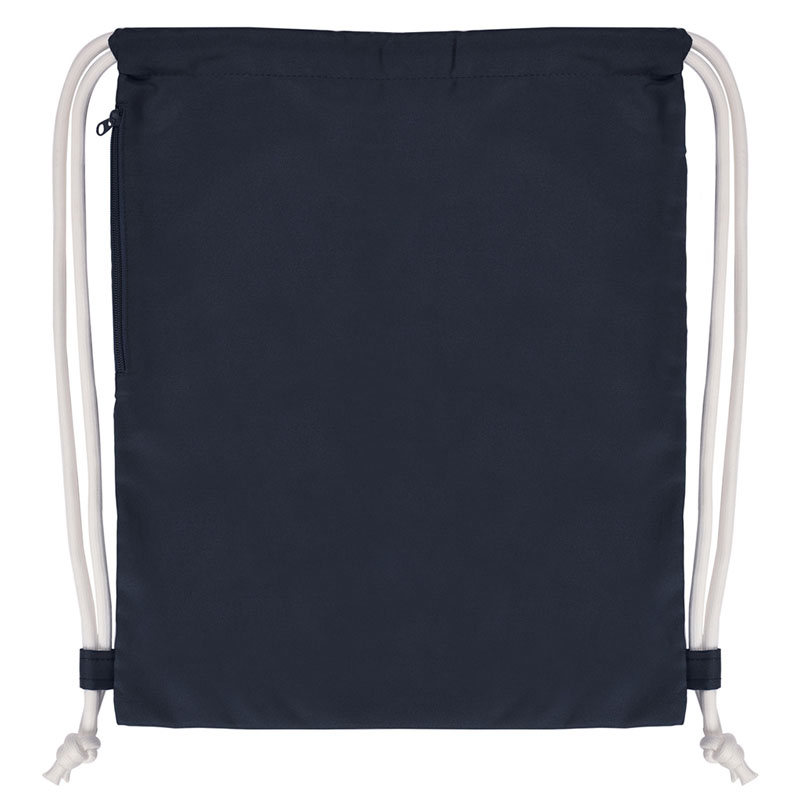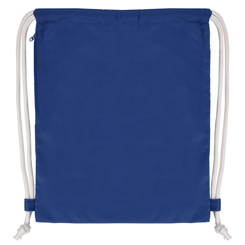 Sacca in poliestere 300D con cordoncini spessi, tasca laterale con chiusura a zip e con passanti agli angoli.