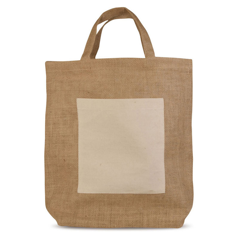 Borsa shopping in iuta con tasca esterna in cotone di colore natural (18,5×19,5 cm. ca.), manici corti.