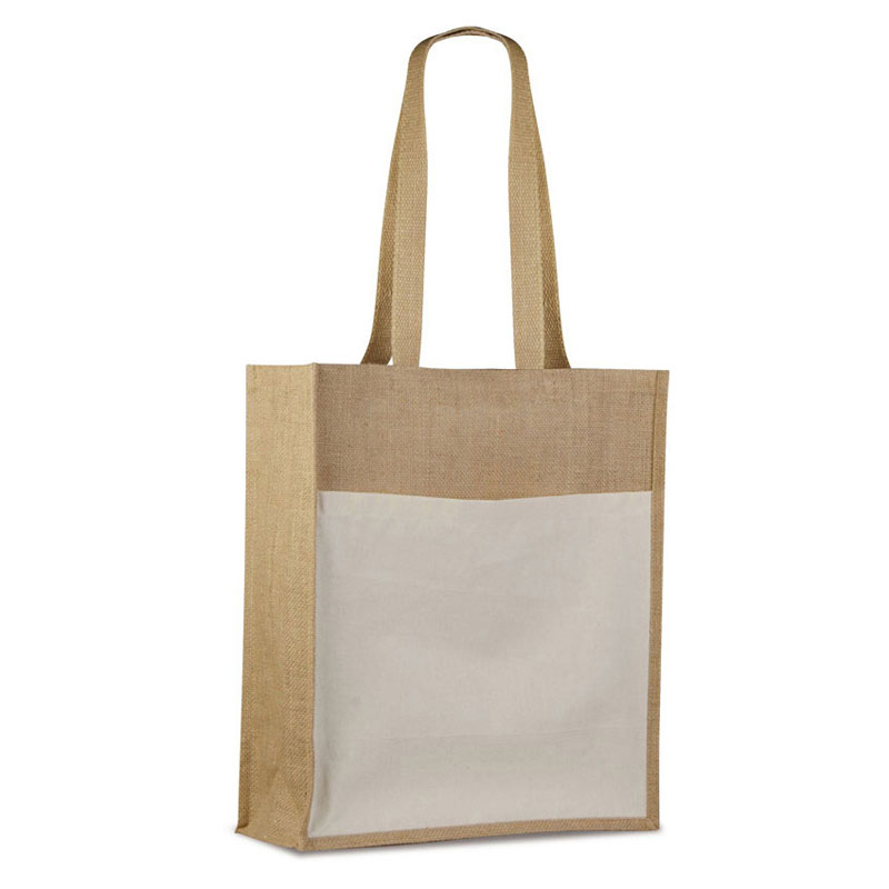 Borsa shopping in iuta con ampia tasca esterna in cotone di colore natural (31×36 cm. ca.), manici lunghi.