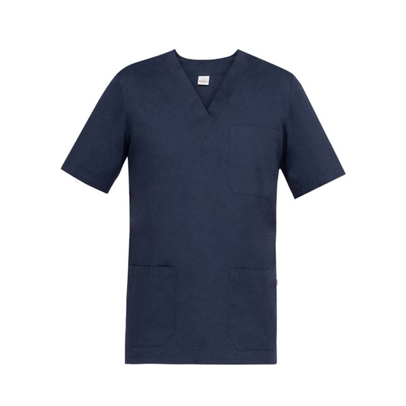 La casacca Piero a maniche corte presenta una scollatura a V valorizzata da una fascia larga che si sovrappone sul davanti.