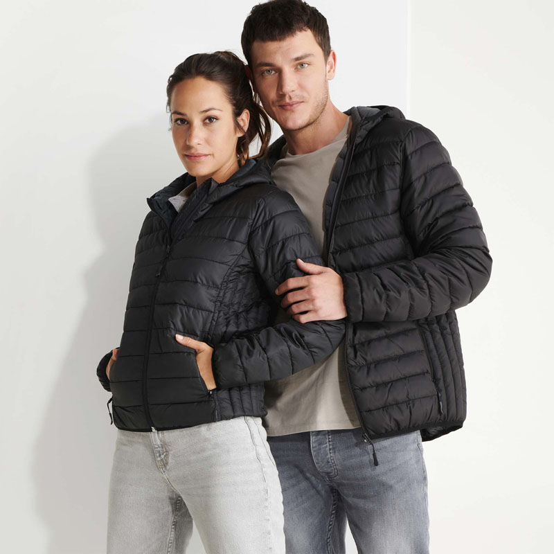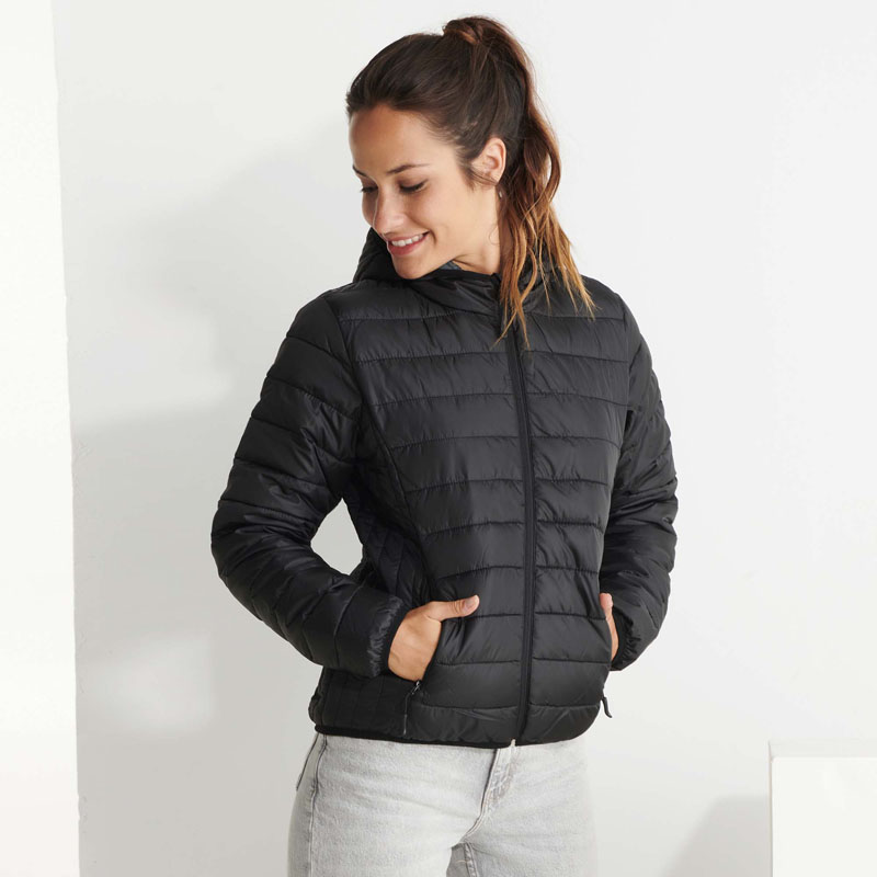 - Giacca da donna trapuntata con imbottititura tatto piuma e cappuccio fisso regolabile