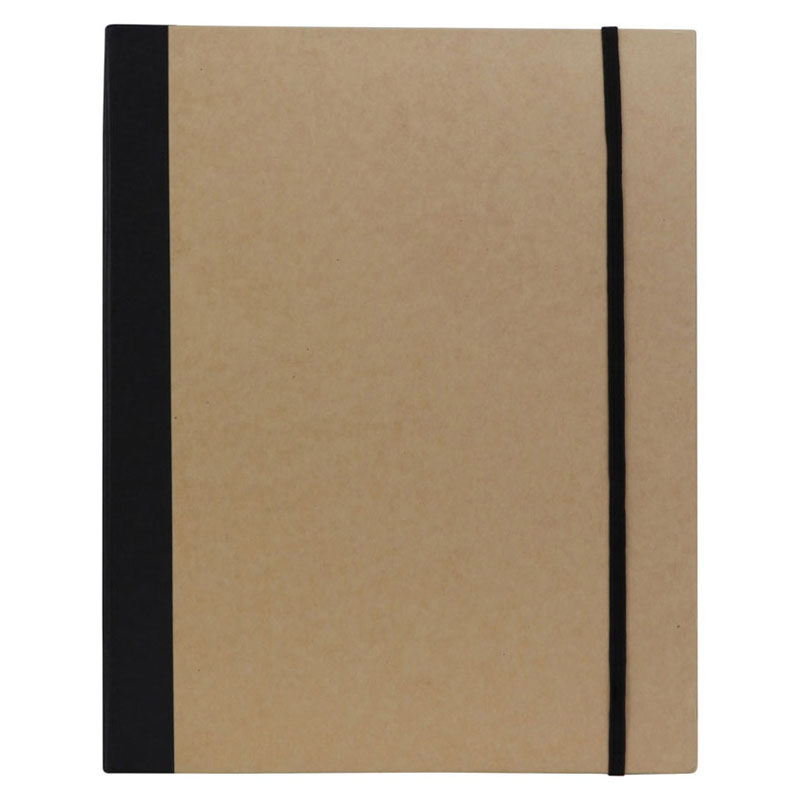 Blocco per appunti formato A4, in cartone riciclato, con penna a sfera in cartone riciclato, segnalibri adesivi, taschine interne, chiusura con elastico.